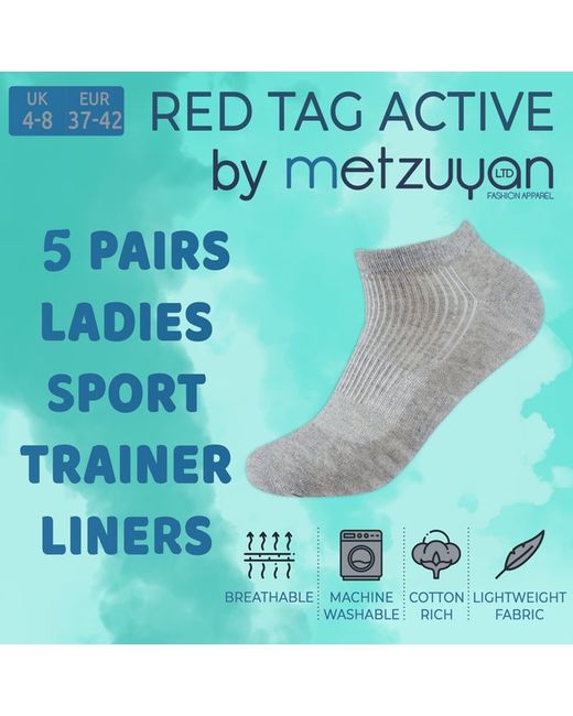 5 PAIRS RAINER SOCKS - 5 Pairs of Ladies Red Tag active trainer sports liners in size UK 4-8 / EU 37-42 are perfect for wearing to the gym or every day. COMFORTABLE FIT - The cotton rich material allows your feet to have a cosy experience. The socks also have a skin-friendly design and wear-resistant properties. COTTON RICH - Made from 65% Cotton, 30% Polyester, 5% Elastane . Benefit from material attributes such as being: super soft to the touch, perfect for all day comfort, moisture wicking, quick drying and easy to wash. IDEAL FOR - Perfect for jogging, running, walking, sports, gym, cycling, yoga or wearing with your work boots, shoes, trainers or for just wearing around the house.