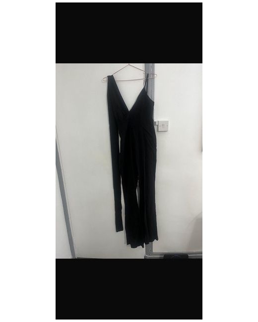 . Black • Jumpsuit • Sleeveless • One Shoulder • Drape Detail • Flare Leg • Stretch • Shell: 59% Viscose 36% Nylon 5% Elastane • Imported Available in size medium and Large