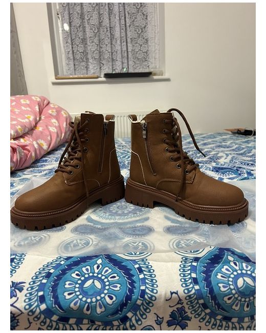 The brown low-heeled snow boots with a side zipper are ankle boots made of PU leather with a fabric lining and insole, and a rubber outer material. They're in size CN35, remain unused as I mistakenly ordered a size smaller.