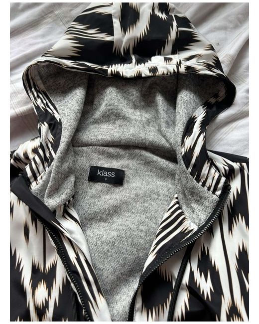 Stay stylish even in the rain with this black and white Klass raincoat. Its elegant style is perfect for any occasion, whether you're running errands or dressing up for a night out. The coat features a unique raincoat design that is both practical and fashionable.