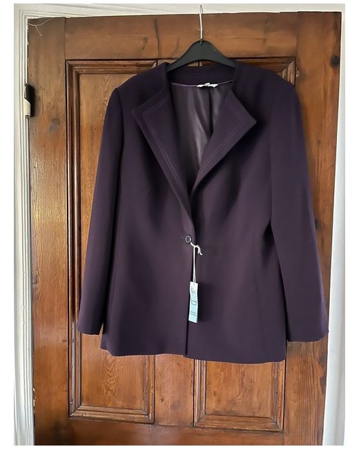 Smart plum coloured hip length jacket by Klass . Lightweight and lined . Ideal for work . Length is 28 inches . No pockets or back collar . Ideal to keep on in work over blouse etc