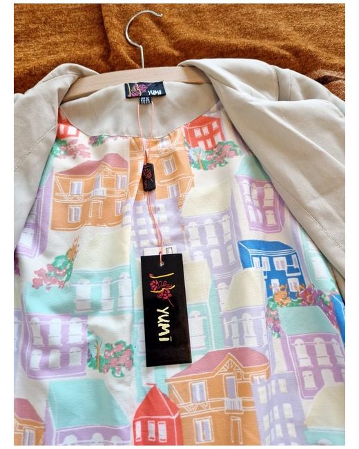 A light jacket with a belt, and colourful lining. Jacket is fastened with a button, and has pockets on the front. Happy to combine postage on items, just ask for an invoice before paying, or I can refund part of the postage.