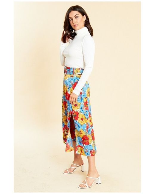 Available in XS to XL, this high rise floral wrap belted midi skirt is made from polyester and features a heart-warming blue, yellow and red floral pattern. Combine with a turtleneck top and your favourite casual sandals for an added effect.