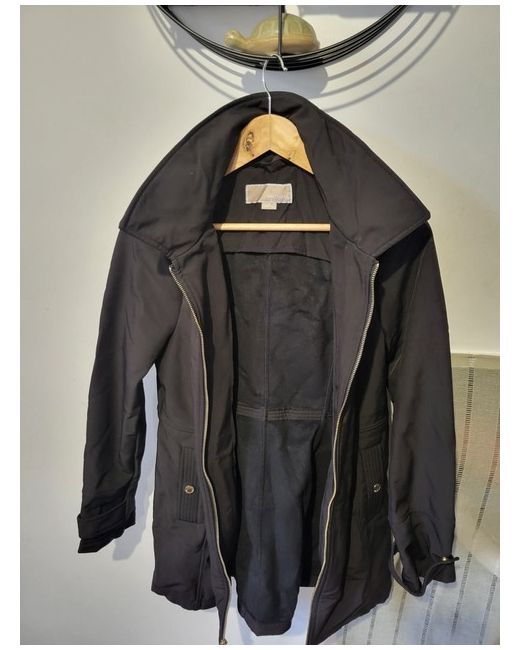 This is a black Michael Kors jacket with a gold accent in a size medium. It is made of polyester with long sleeves and a zip closure. The jacket has a quilted style and a regular fit, suitable for casual occasions. It is designed for women and is of a high-quality brand. The jacket is crafted in China.