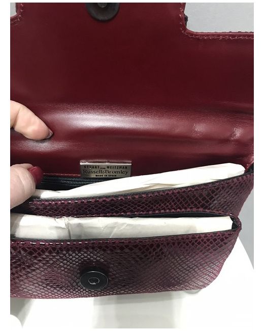 LUXURY VERY SOFT HIGH QUALITY GLAM DESIGNER Stuart Weitzman for Russell & Bromley. RRP £325 New Authentic & Genuine Stuart Weitzman Burgundy with Black/Burgundy Snakeskin Style Luxurious Soft Leather Mini Bag w Gemstone chain and Dust bag. Please see photo for measurements. Please see other listings.
