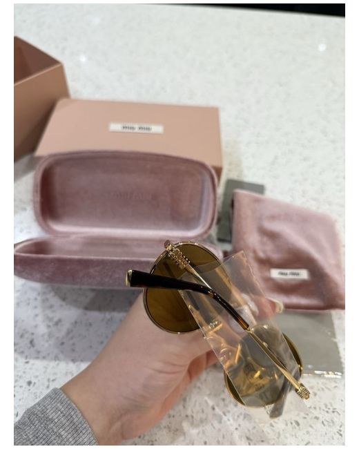 These Miu Miu sunglasses for women feature a gold frame with a stylish design. They are brand new with tags and are ideal for adding a touch of glamour to any outfit.