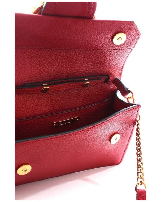 RRP £950.00. Made in Italy with a commanding gold-tone buckle that is adorned with chunky faux-pearls and glittering crystals. One detachable gold-tone chain and red leather shoulder strap. Front flap.