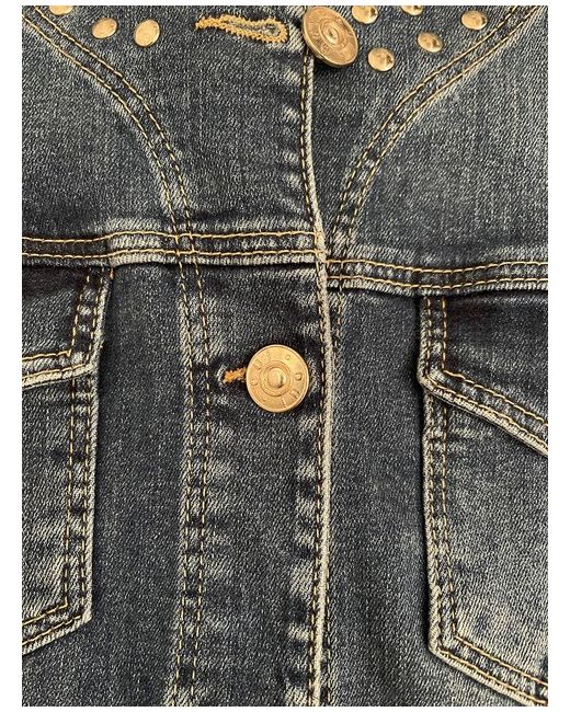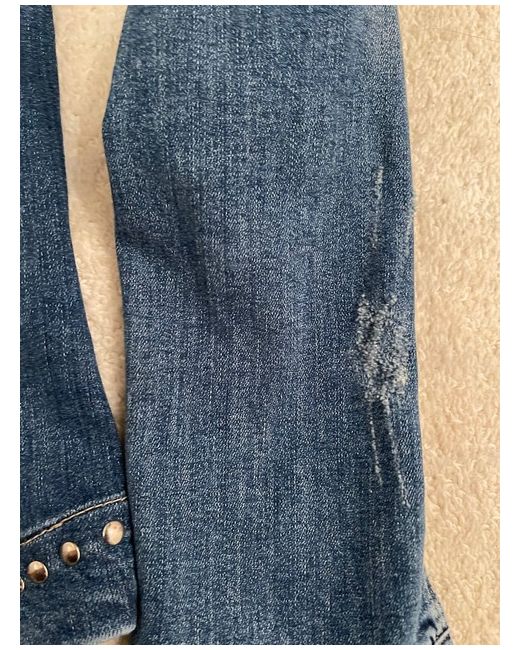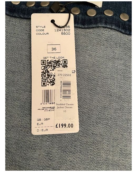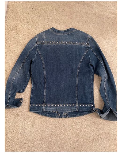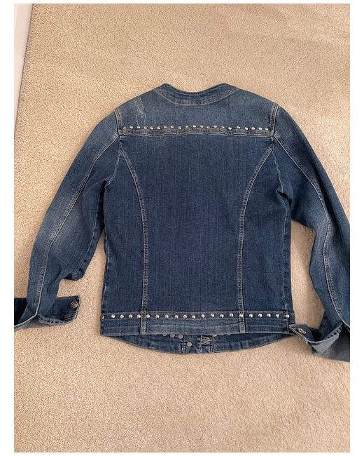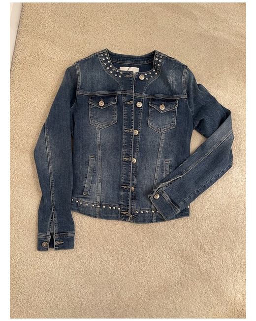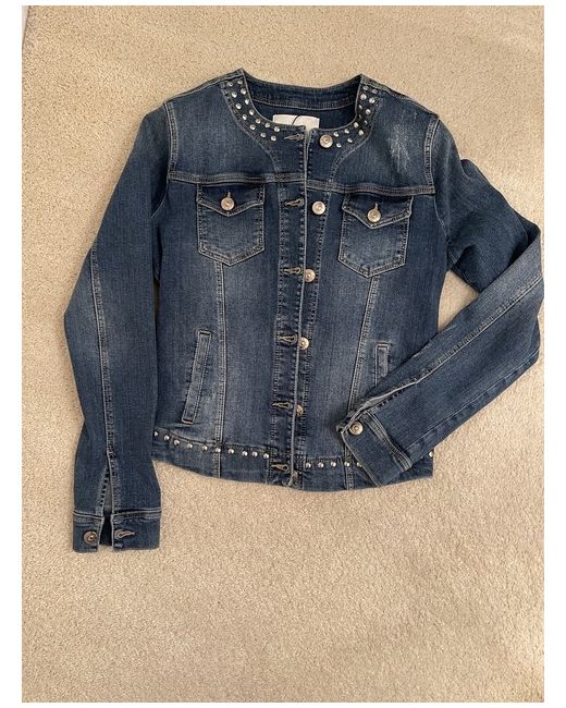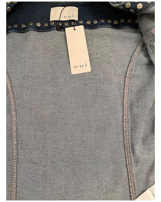 Oui Studded Denim Jacket Size 10. Beautifully styled fitted denim jacket -feminine waisted shaped fit -stretch denim. Collarless style with Oui logo metal stud button fastening at front. Two small breast pockets with matching logo buttons -and two front side pockets concealed. Distressed denim fabric . Stud detailing to collar line and hemline. Condition is "New with tagsā.