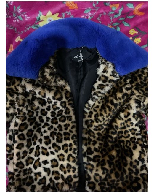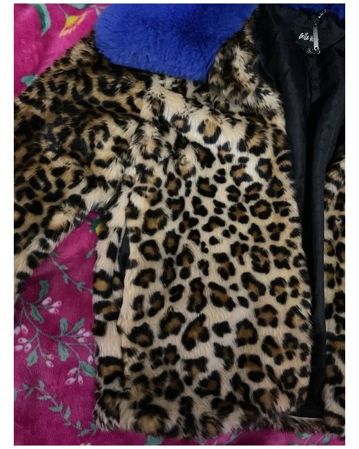 This women's coat features a striking leopard print design in multicoloured faux fur, with long sleeves and a button closure. The size is a small / UK 10, offering a regular fit for a stylish overcoat suitable for casual occasions. The brand is Belle Vere, and the coat exudes a theme of leopard print throughout, making it a fashionable addition to any wardrobe.