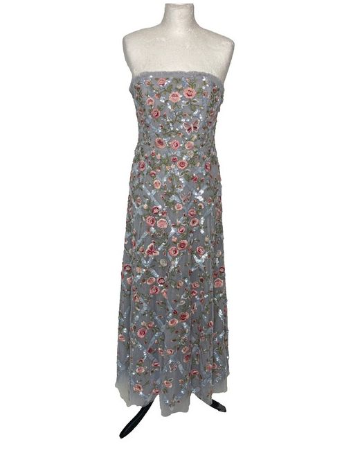It is fully lined with an internal structured corset for added shape and secure hold. The dress is wrinkle-resistant. A sequin trellis design adds sparkle. The dress is a size 10 and has a long strapless design with an off the shoulder neckline and a zip closure at the side.