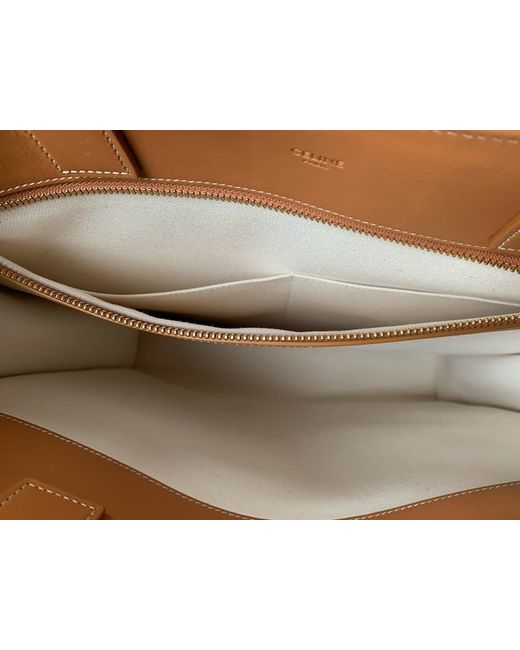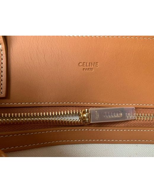 Beautiful Celine Cabas Tote Bag. From the fall 2019 collection by Hedi Slimane. Neutral canvas with Celine graphic print on the front, brown leather trim, and handles. Made with gold-tone hardware, an open top, and one interior zipper pocket. New without tags. Made in Paris