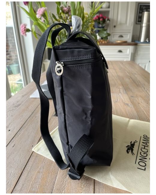 The Longchamp Le Pliage Original Backpack in black is a stylish and practical choice for women. Made from durable nylon with leather accents, this medium-sized backpack features a zip and button closure, silver hardware, and a black nylon lining. The iconic embroidered horse design adds a touch of luxury to the plain exterior, making it a versatile accessory for everyday use. The backpack comes with a bag charm and original dust bag, and is part of the Longchamp Le Pliage product line, perfect for those who appreciate Parisian elegance.