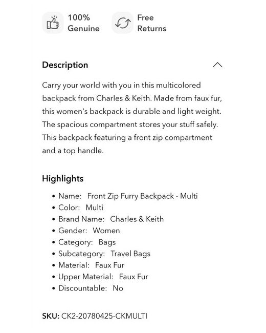 Introducing the CHARLES & KEITH Furry Backpack, perfect for the stylish and trendy women out there. This backpack is designed to elevate your fashion game with its unique fur detailing and sleek design. Crafted for durability and practicality, this backpack will be your perfect companion for all your daily adventures. Its spacious interior can accommodate all your essential items, making it an ideal accessory for any occasion. Get ready to turn heads and make a statement with the CHARLES & KEITH Furry Backpack.