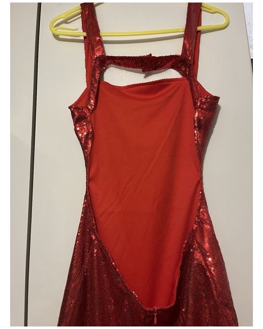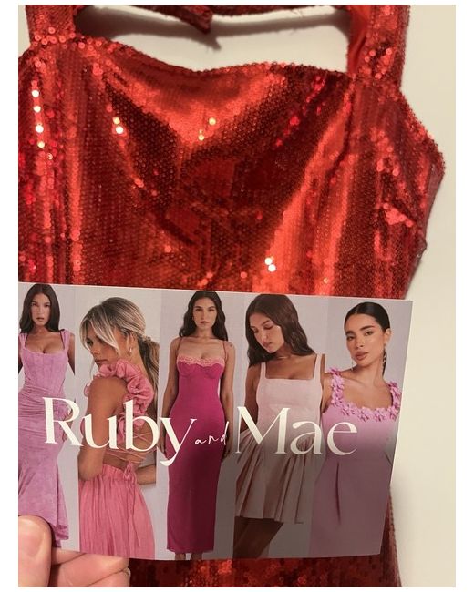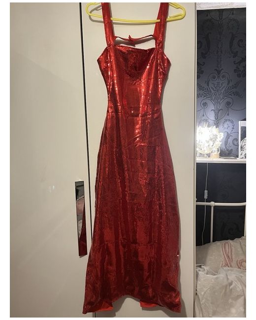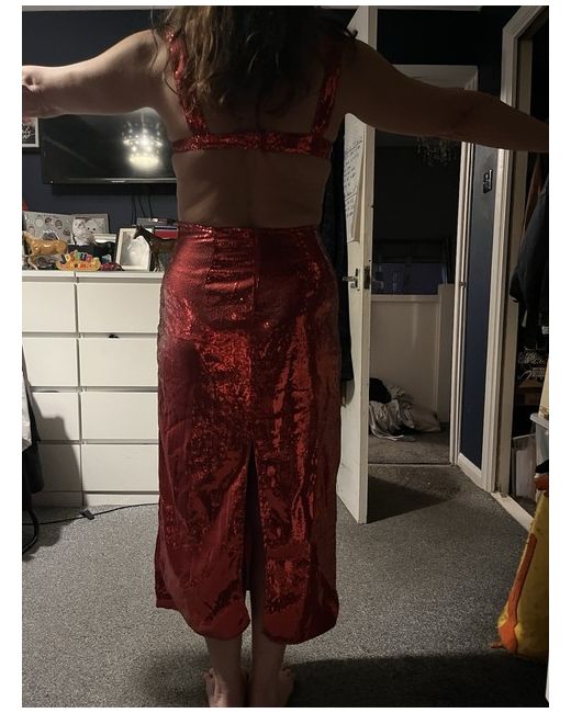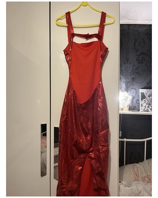 This is a stylish red backless pencil dress by Ruby@Mae in size 10. It features sequin accents, adding a touch of glamour. The dress is a midi length, perfect for a special occasion.
