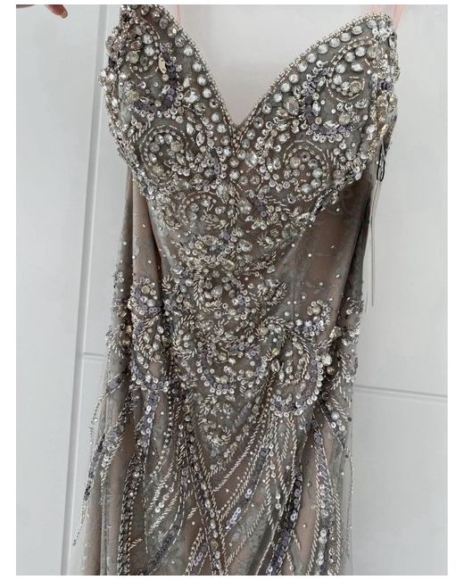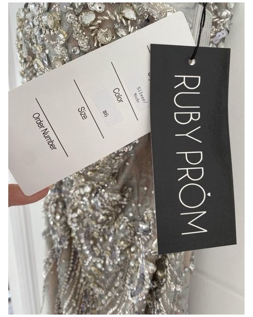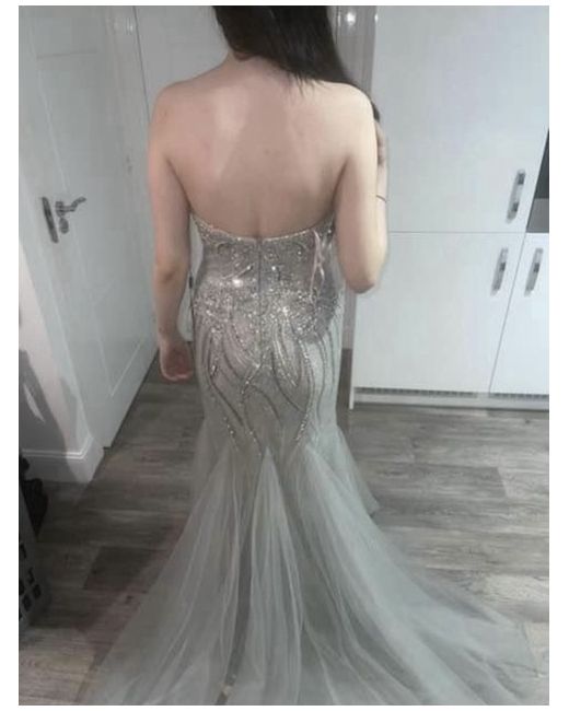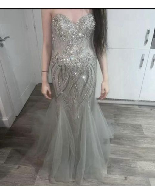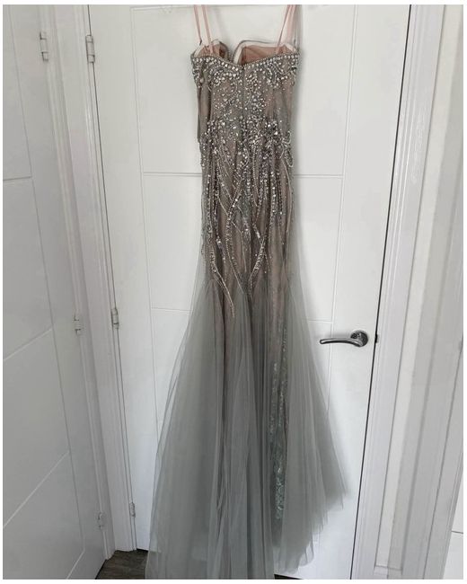 This elegant prom dress is designed by Ruby Prom in a size 8. The dress features a sleeveless fit & flare style, made of chiffon fabric in a long length. Perfect for formal occasions and parties, the dress comes in a sophisticated grey colour overlay with blush pink underneath, ideal for making a stylish statement. Ideal for women looking for a sophisticated and glamorous outfit for special events. It was bought for our daughters prom but sadly it was cancelled so it’s never been worn, it’s an absolutely stunning dress