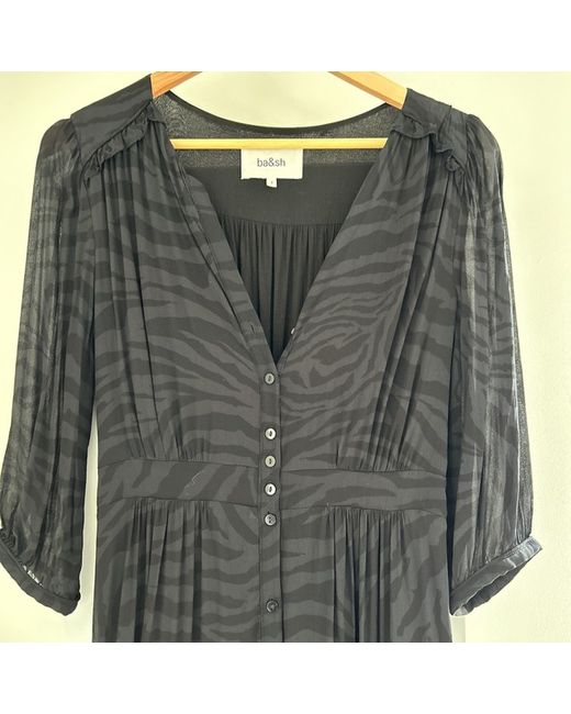 Stunning black and navy blue zebra print Ba&sh dress in size 2. The fit and flare style is perfect for any occasion, whether it be for travel, workwear, or casual wear. The 3/4 sleeves and midi length add a touch of elegance to the dress, while the viscose fabric ensures comfort and breathability. The dress is versatile and can be dressed up or down with the right accessories. Practically new as I have the skirt version and use the skirt more The size 2 for this dress is like a size 10 - bust =91, waist = 73 and hip 98cm , hope this helps .