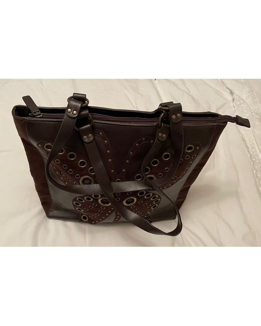 It is brown with a stud pattern Butterfly on one side of the bag. It is in a faux leather style finish. Overall size is 38cm (W) x 28cm (H) x 8cm (D).