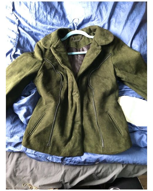 Real suede Olive green jacket suitable for size 8-10. No tips or tears and might need a little ironing. Otherwise in perfect condition :)