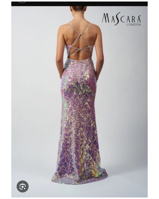 Brand new with tags. This super sequined, elegant, size 8 dress is a Mermaid style with scale-like detail. A criss-cross back with sparkle diamante beading on a spaghetti strap, this dazzling dress is a show stopper and is absolutely stunning.