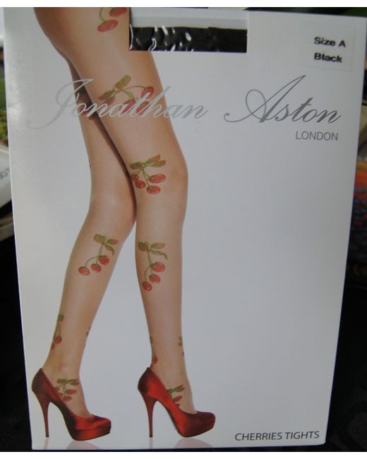 From Jonathan Aston Fashion Tights: "Cherries" in black sheer tights with delicate red cherries and green leaves all over the legs. Made of 54% Polyamide, 9% Elastane, 37% Polypropylene. They feel lovely and soft.
