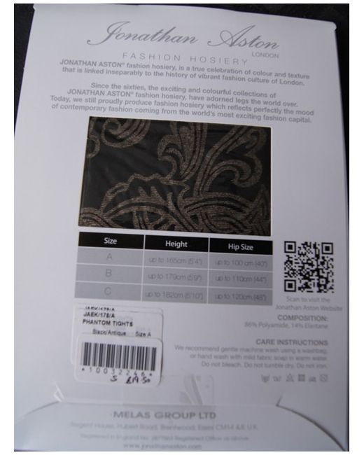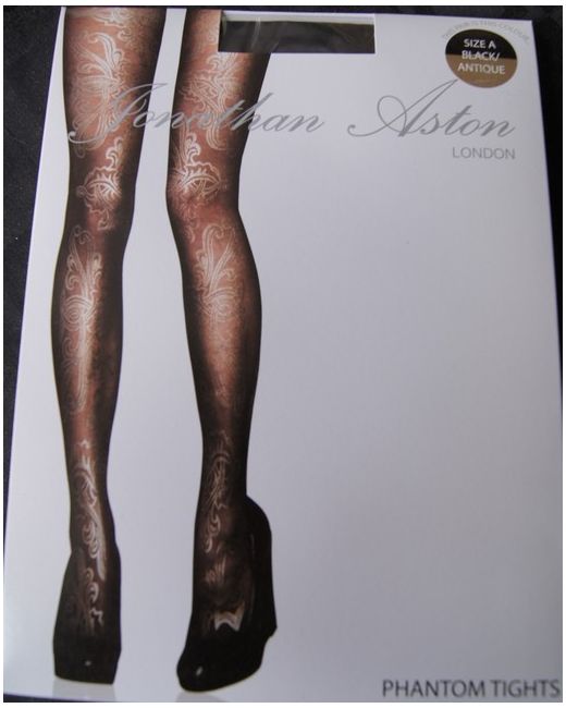 From Jonathan Aston "Phantom", Black with Antique Gold art nouveau patterned tights with a soft sheen. Made of 86% Polyamide, 14% Elastane. They feel lovely and soft. Made in Italy. New and unused.