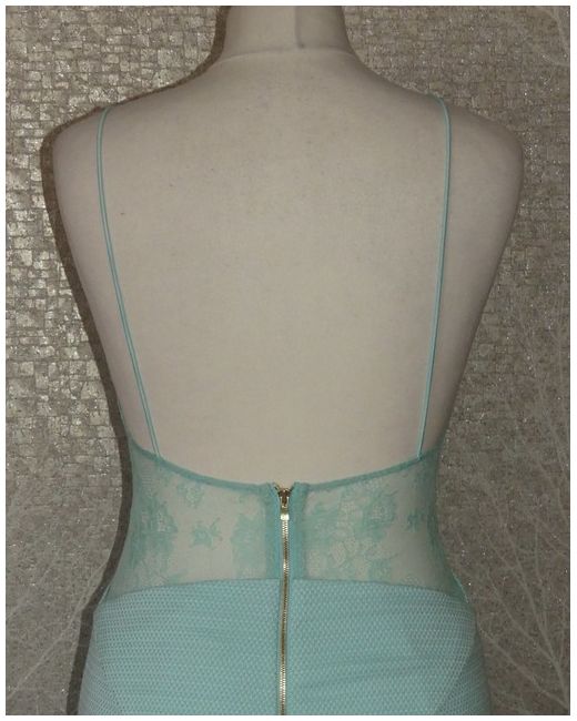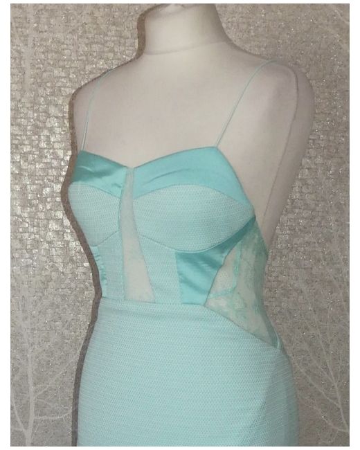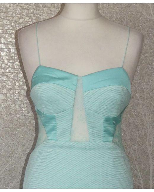 Stunning Three Floor sexy party cocktail mini dress in Celadon /turquoise / aqua shade. Woven fabric with satin trims and floral lace sections. Perfect party dress. Sweetheart neckline with inset lightly padded bralet style.