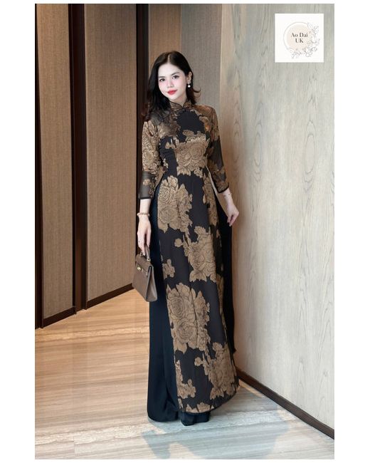 Style: traditional ao dai. Pants: black silk. Sleeves: 3/4 sleeves.