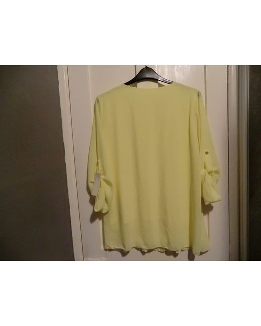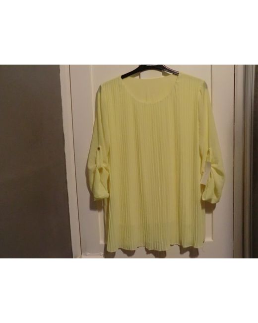 Yellow pleated front floaty top. There is a t shirt like layer under top. There is no size on it but l would say it is size 18.