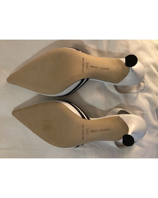 This product is a pair of UK size 7 white leather heels from Manolo Blahnik. The black trim/leather detail and The pointed toe style and kitten heel make them suitable for various occasions such as weddings, parties, or even formal events. Made in Italy, these slingback heels are a stylish addition to any woman's wardrobe, perfect for autumn, summer, and spring seasons. The leather lining and insole provide comfort and quality, while the leather outsole ensures durability. New with box and dust bag.