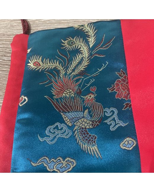 Newly handmade beautiful multi use bag. Oriental jade colour material with birds contrasting red with drawstrings Could have many uses makeup / toiletries, suntan bottles etc.