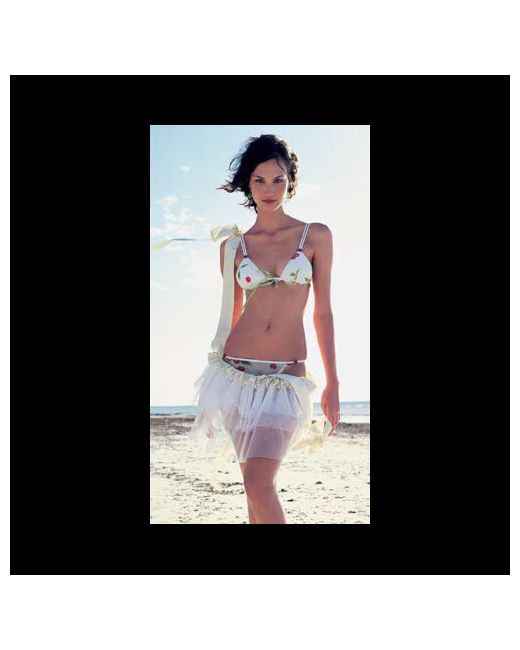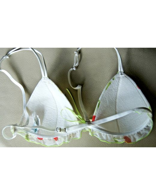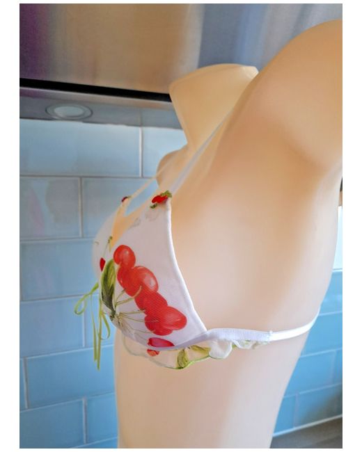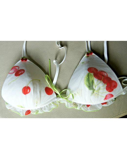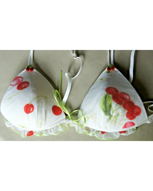 Verdissima Style 5E H TC26 in white tulle covering this wire free triangle bra with a pattern of red and green cherries with soft beige shadow flowers. Under the under band is a gathered band of white tulle with cherries on it, this is edged with green stitching so that the edge forms soft gathered waves.