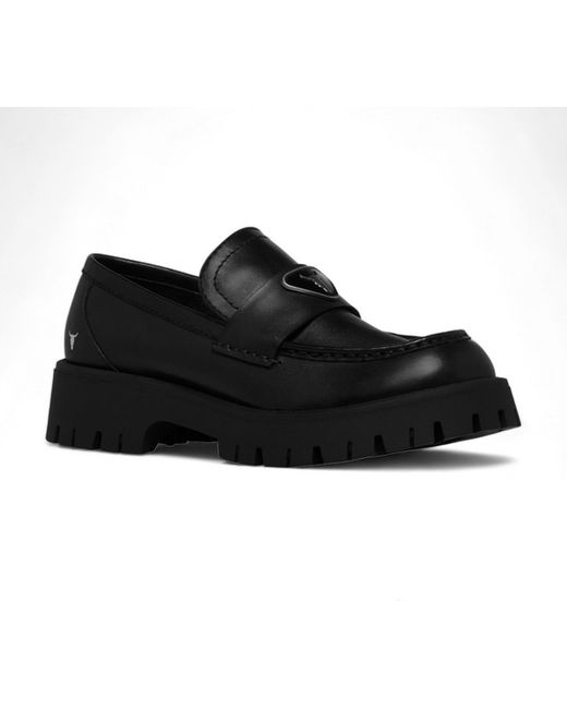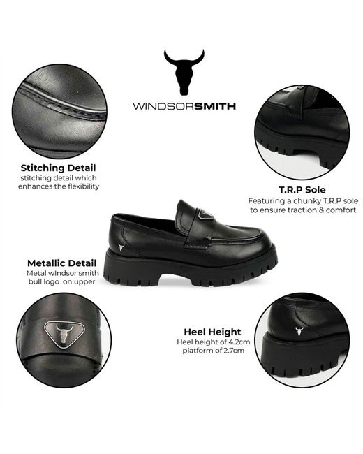 With a sleek leather upper and chunky cleated sole, these loafers are designed for both style and durability. Moccasin stitching detail. Chunky cleated T.P.R sole. Platform height: 2.7 cm. Black leather upper.