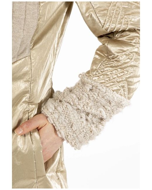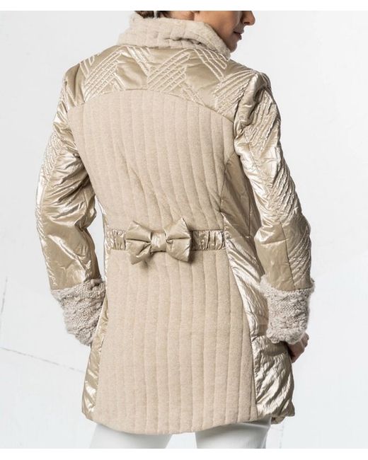 Beige quilted jacket. Fur collar and knit cuffs with embossed embroidery. Back bow to achieve a fitted effect. Asymmetrical wavy hem. Zipper closure and jeweled zipper pull. Modern and feminine jacket with romantic lines and mix&match of fabrics and textures. Fabric 1: 70% viscose 16% polyester 14% cotton Fabric 2: 60% acrylic 40% viscose RRP: €485,00