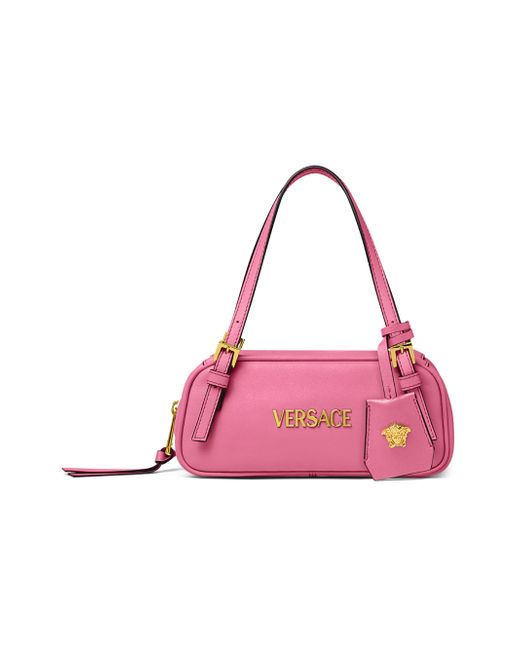 Crafted of leather, Versace's mini shoulder bag features goldtone logo lettering and a signature Medusa head. Shoulder strap Top zip closure Leather Lining: polyester Made in Italy SIZE About 7.48"W x 3.34"H x 3.34"D ABOUT THE BRAND Founded in 1978, Versace is instantly recognizable by the signature Medusa head logo, chosen by founder Gianni Versace for its Greek symbolism. The Italian label is known for its luxe, bold clothing and accessories-think gilding, oversized logos and punchy prints. Since taking over artistic direction, Gianni's sister Donatella Versace has maintained the brand's strong identity, with a renewed vision to give customers the ultimate freedom to express themselves. Handbags - Italian Designers > Versace > Saks Fifth Avenue > Barneys. Versace. Color: Dragon Fruit Versace Gold.