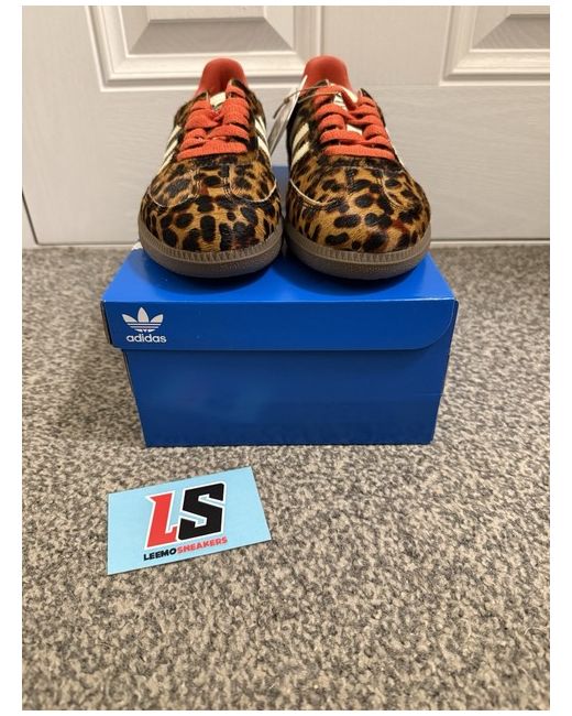 Elevate your sneaker game with these stylish Adidas Samba trainers in a bold orange leopard print. The iconic three stripes and Adidas branding on the tongue and heel provide a classic touch to these trendy shoes. Perfect for women who want to make a statement with their footwear, these trainers are versatile enough to be worn with any outfit. Crafted with high-quality materials, these pre-loved sneakers are in excellent condition and have been well-maintained to ensure their longevity. The comfortable fit and classic style make them ideal for everyday wear, whether you're running errands or meeting up with friends. Don't miss out on adding these Adidas Samba trainers to your shoe collection.