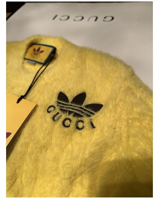 This is a Gucci Adidas women's yellow top in size medium. It is a regular fit t-shirt with short sleeves. Perfect for casual wear, this top combines the style of Gucci with the sporty touch of Adidas, creating a unique and fashionable piece for women. This is a very rare piece made of an incredibly soft material and is definitely a piece to help you stand out.