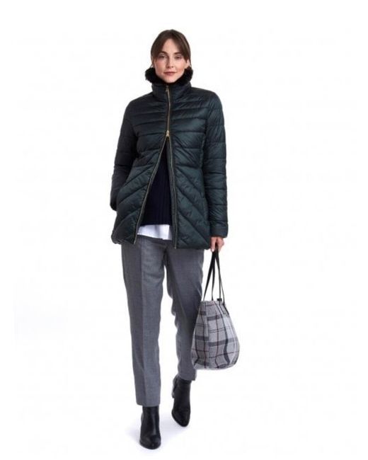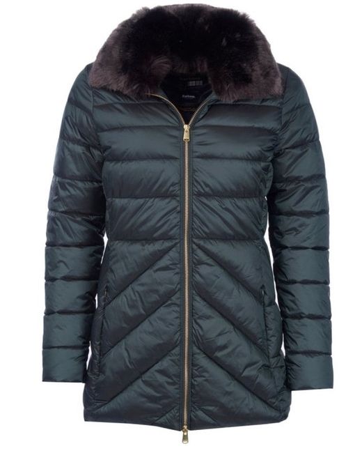 Tonal Barbour embroidery to wearer's left pocket. Remove trim before washing. Cut to a mid length with an elasticated back for enhanced comfort, this luxuriously warm jacket is crafted in a combination of chevron and baffle quilting.