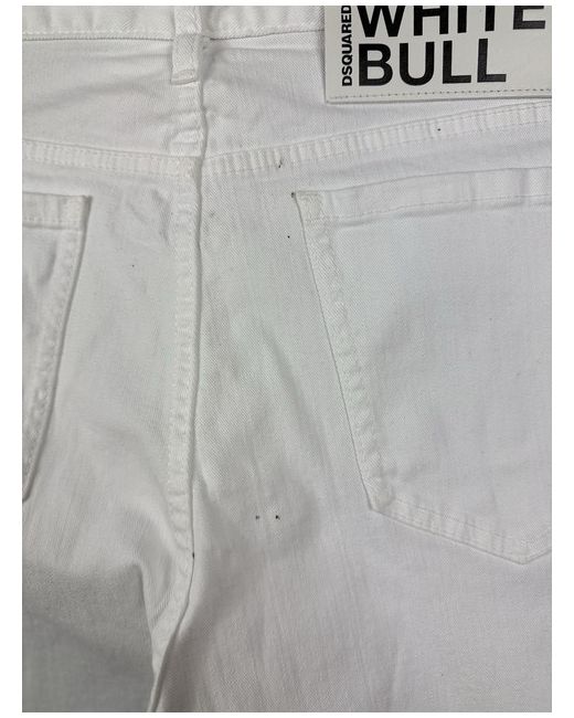 Dsquared2 white bull kawaii jeans. High-waist, cropped, classic five pockets style, button closure, belt loops. Regular fit sized XS UK 6. Denim fabric 98% cotton 2% elastane. Some small defects because of white colour, removable after washing. Costs 450Ā£. Check carefully measurements and photos before purchasing. Returns not accepted. Happy buying š