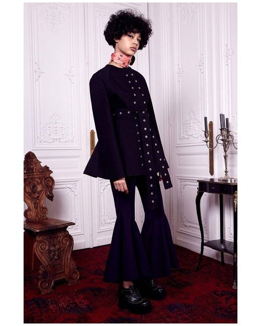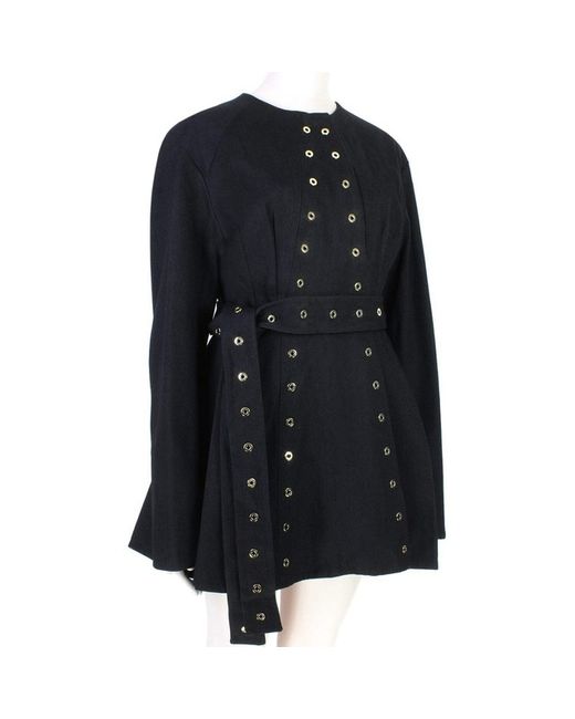 Ellery Jacket Ellery Black Eyelet Detailed JacketSize: AU4 / IT40 / UK8 / FR36 / US4Colour: BlackMade in AustraliaMaterial: 100% cotton. Lining 100% silk. Ellery collarless jacket in a heavyweight twill black cottonGold tone eyelet detailing to the jacketDouble layered at back with flare to the hemlineTie fastening to the waistConcealed button fasteningFully lined in silk.