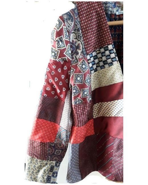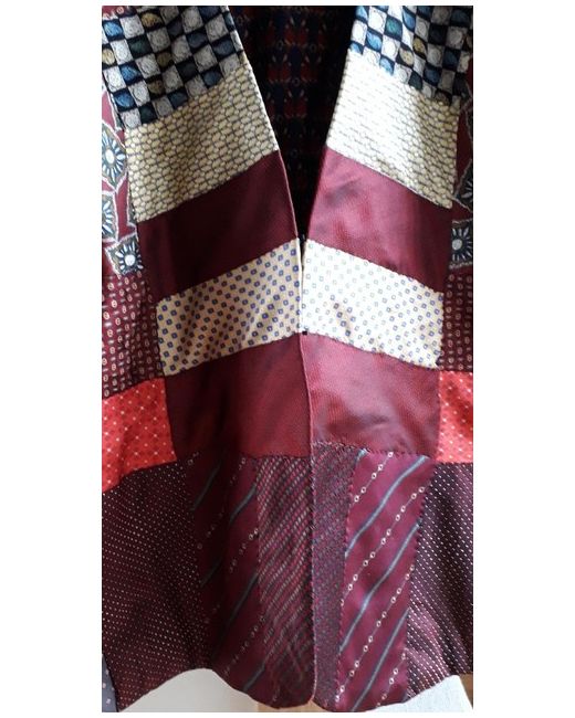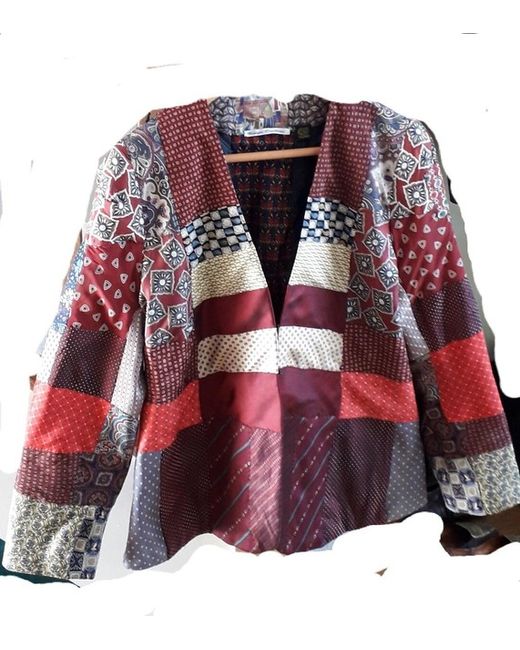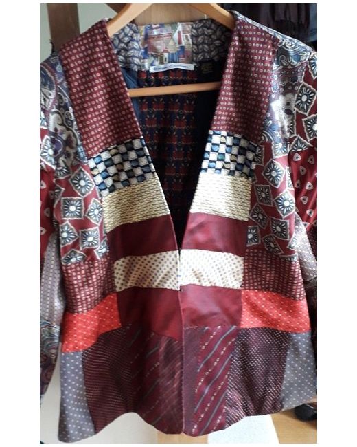 Size 12/14 the model in the picture is 6ft tall. Centre back to hem 67cms armpit to armpit 56cms neck to shoulder seam 12cms length of sleeve from underarm 41 cms. This beautiful hand stitched jacket by Unique Creation is made with upcycled silk from Moshino, Kenneth Cole New York, Geeves and Hawkes, and Italian silk.