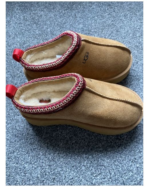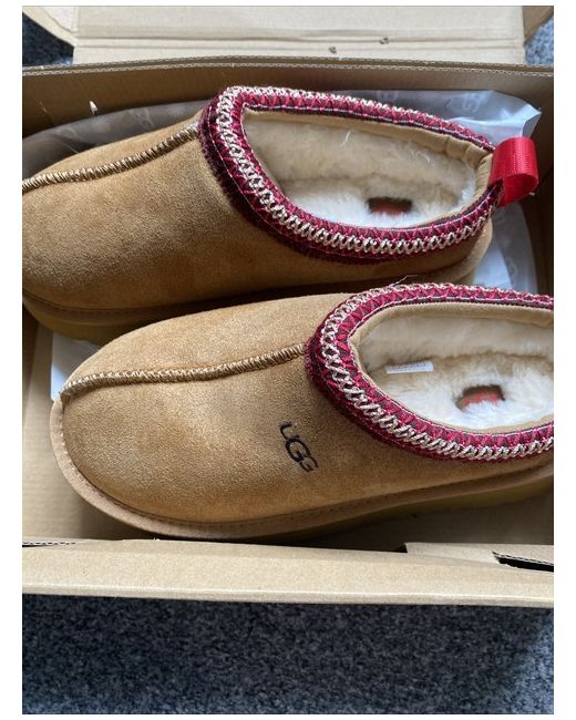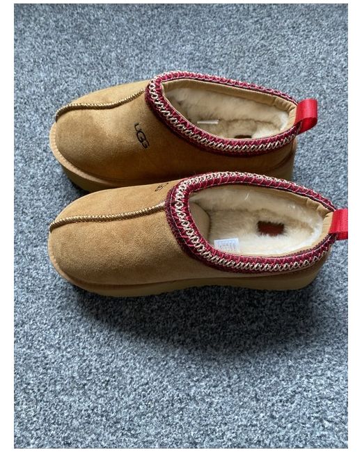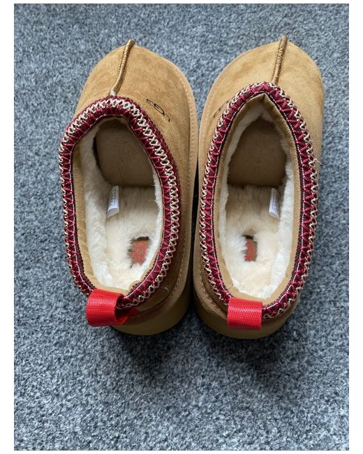 The UGG Australia Tasman slipper is a comfortable and stylish choice for women, featuring a slip-on design with a round toe and sheepskin lining for warmth. Made of brown suede with the signature UGG logo accent, these boots are perfect for casual occasions during the winter season. The classic Ugg style offers a touch of luxury with its comfort features and high-quality materials, making them a versatile addition to any wardrobe.