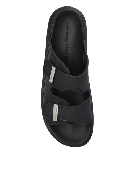black adjustable buckle straps round open toe rubber sole branded insole engraved logo