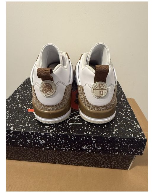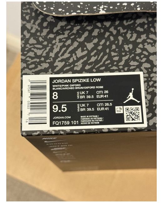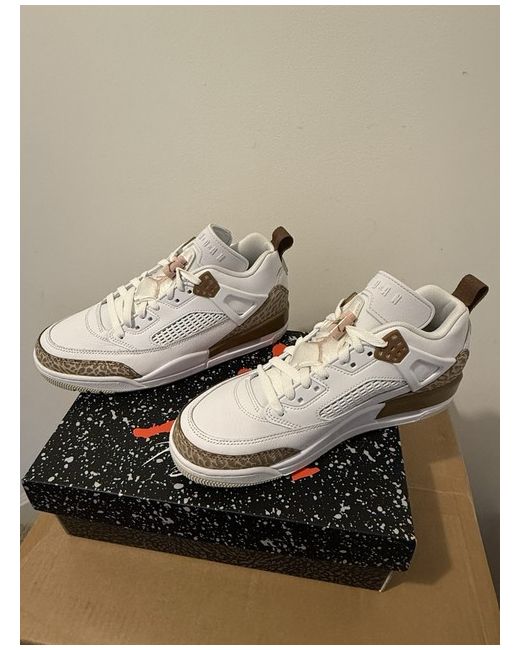Nike Jordan Spizike Low in White and Pink Oxford, featuring a lace-up closure and a low-top shoe shaft style. This men's trainer in UK size 7 (US size 8) is designed for casual wear. The shoe is part of the Jordan product line and showcases a leopard pattern with a synthetic upper, rubber outsole, and cushioned, breathable design for comfort. Ideal for various activities like gym, walking, and basketball. New from my personal collection