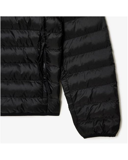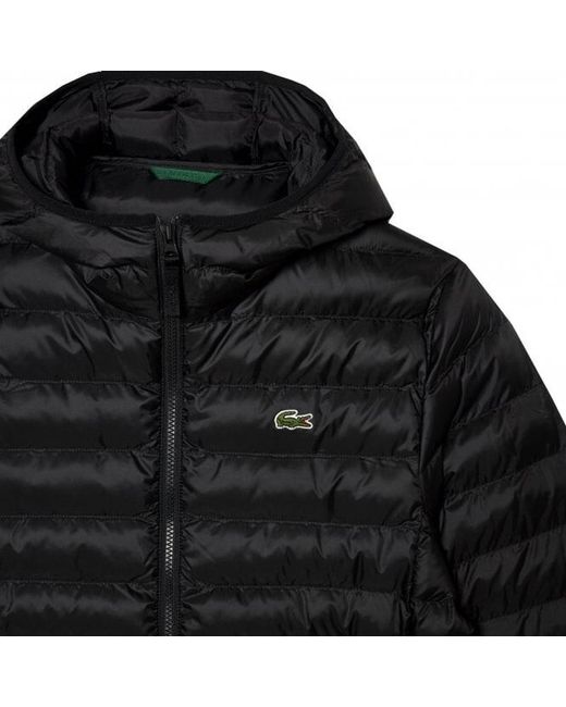 Lacoste men's black quilted jacket. This jacket is hooded with a stand collar. Made from a water repellent fabric in a fiber filling quilted design for warmth. Complete with concealed zip pockets, zip fastening and embroidered Lacoste crocodile Logo to the chest. Two inside pockets. Certificate of insulation. 100% Polyester. Machine washable.