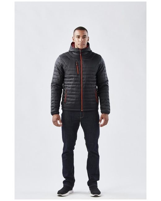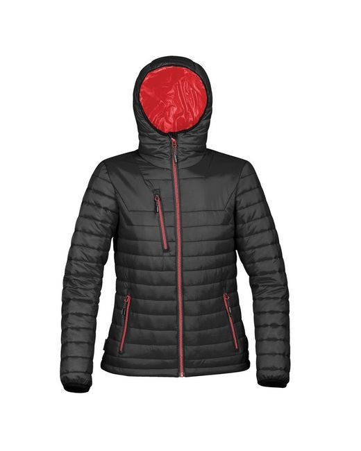 Durable water resistant outer shell. Quilted body with ultra soft liner. Centre front vislon zipper with contrast zipper teeth. Elasticized cuffs. Attached hood. Adjustable hem. Set-in sleeves.