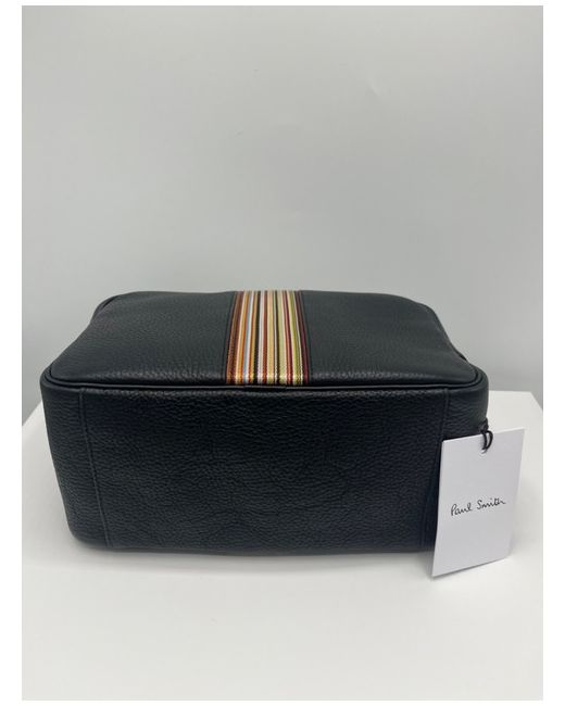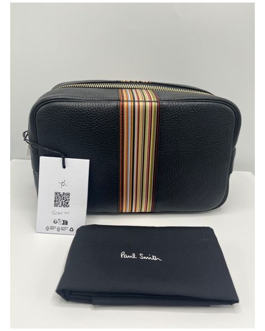 Gold coloured signature tie zip. 100% Calf leather with cow leather trim. Paul Smith Signature Stripe. Paul Smith Signature Stripe black leather. Paul Smith gold foil signature square badge. Black with Signature Stripe central band.