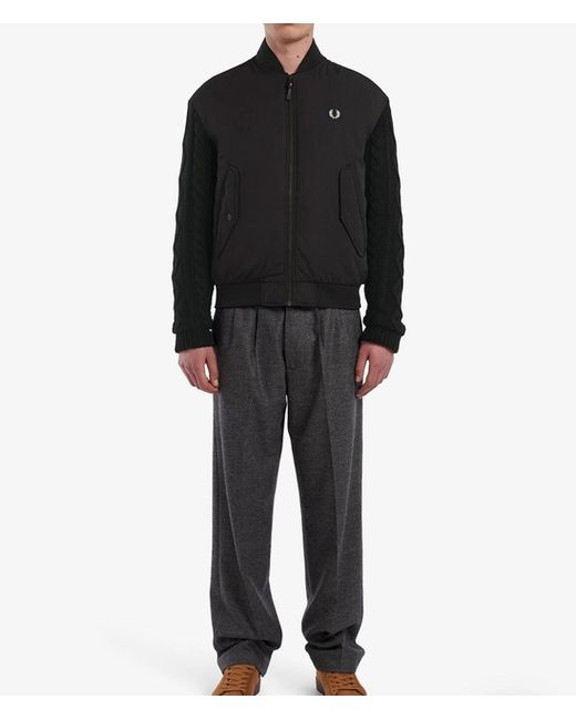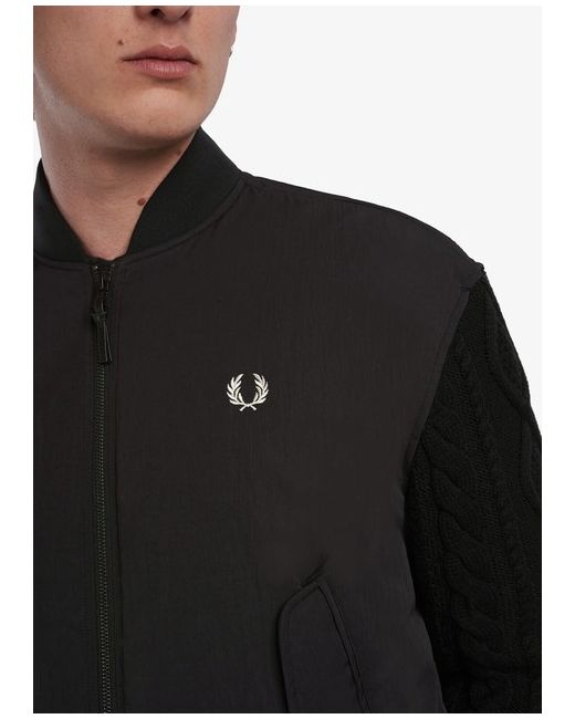 The Fred Perry Black Knit Sleeve Bomber Jacket is a versatile and stylish piece that is perfect for any wardrobe. The jacket features a classic bomber style with a zip-up front and ribbed collar, cuffs, and hem.