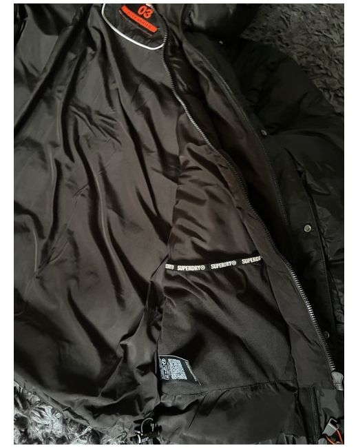 This Superdry men's jacket in size M is a black mid-length puffer style with a polyester outer shell and lining. It features a zip and button closure, full zip front, and is designed for winter outdoor activities. The brand is Superdry, and the model is SuperDry. Perfect for staying warm and stylish in cold weather.