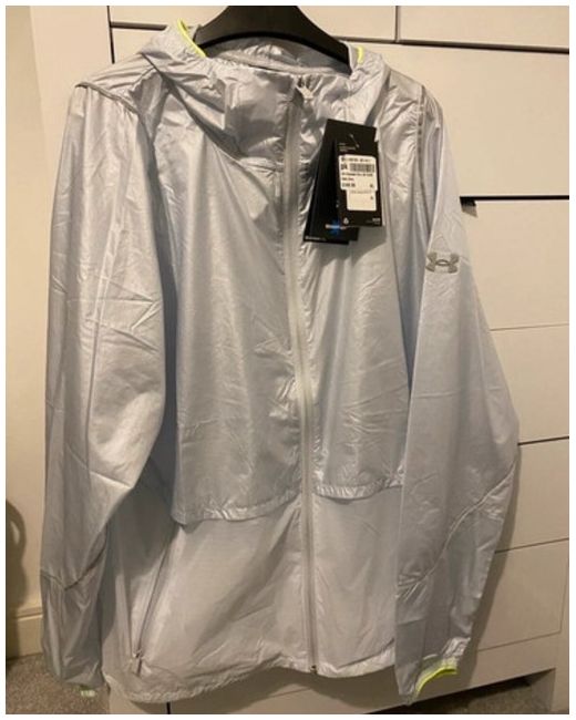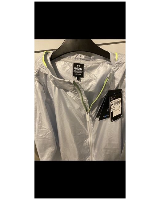 This is a new XL men's Under Armour windrunner in silver with lime trim. It is part of the Under Armour Run product line, designed for running and jogging. This activewear top is suitable for athletic occasions.