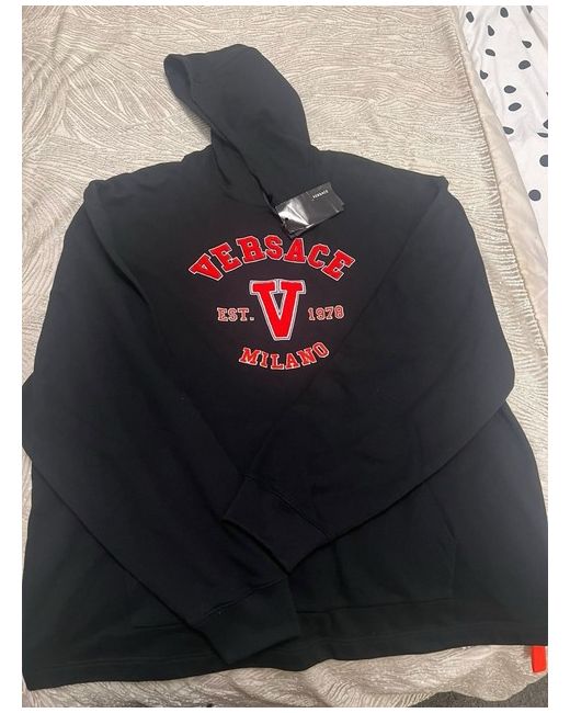 This is a Versace cotton hoody in size X large for men. It is a pullover style with a hood and features the Versace logo patch. The hoody is black in colour and is new with tags. It is a great addition to any man's activewear collection.